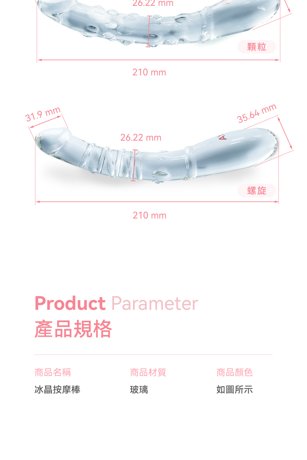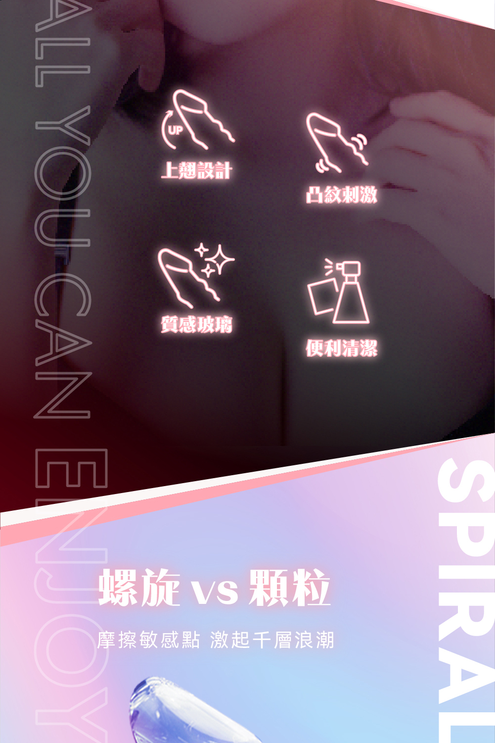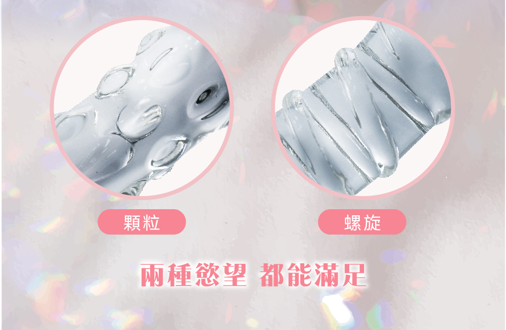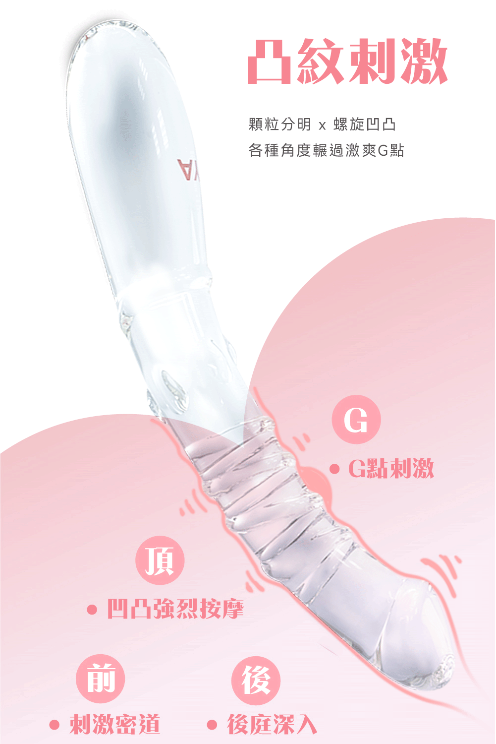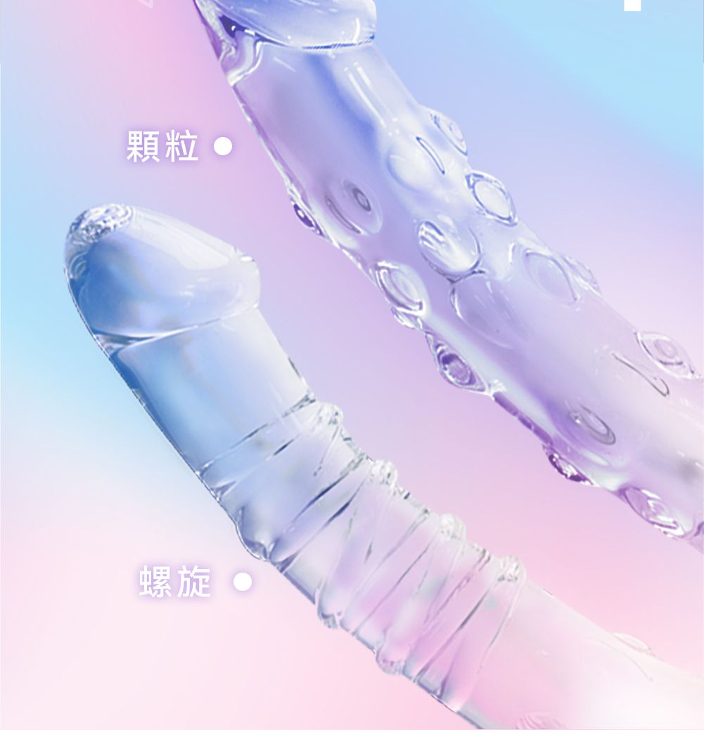 玻璃材質可加熱/冰鎮,享受冰火二重天的溫差快感。上翹 G 點設計+凹凸螺旋紋理,貼合陰道內壁直擊深處敏感區。可水洗消毒,質感與衛生兼具。