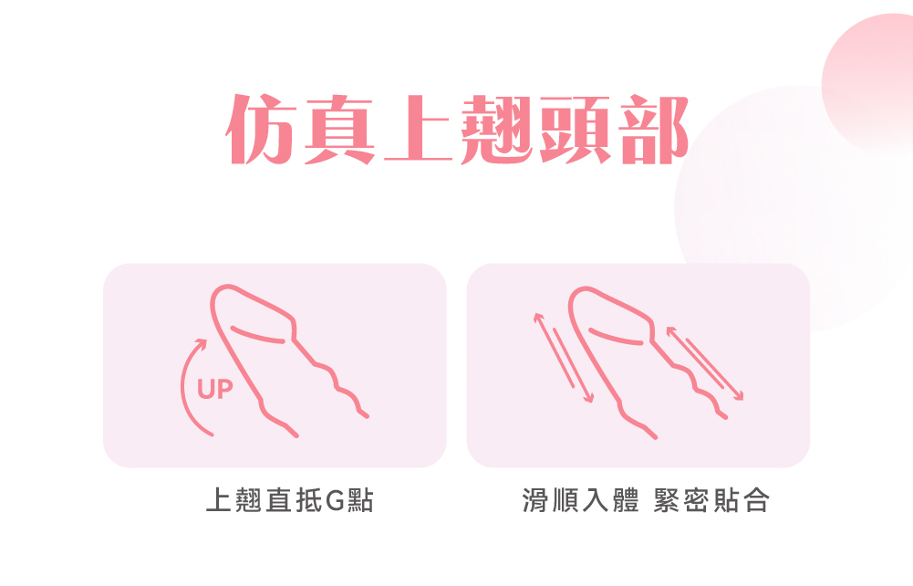 l 仿真上翹設計:模擬真實陰莖角度與形狀,上翹棒頭設計可直接貼合G點,進出時自然產生壓迫與摩擦,帶來高潮感更集中。